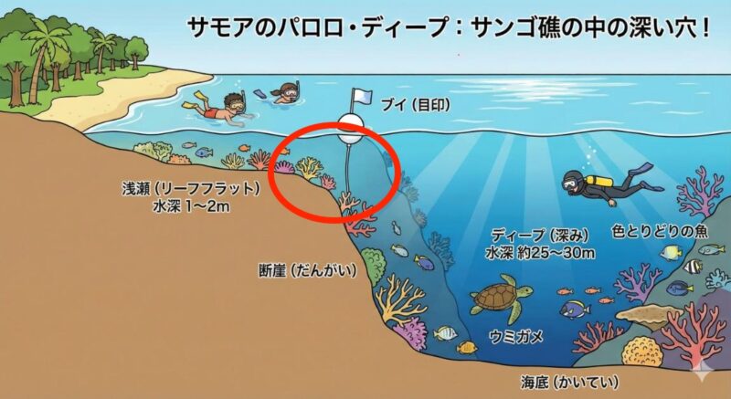ビーチから泳いでいくと、しばらく浅瀬のサンゴ礁(リーフフラット)が広がっていますが、突然、すり鉢状に深く落ち込んだ「ディープ(深み)」が存在する場所があり、その場所がパロロディープと呼ばれるスポットになります。